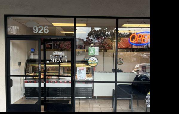 Al-Noor Zabiha Meat Market in Diamond Bar, CA is a specialized halal meat market featuring a butcher case showcasing the day's fresh cuts upon entering the store. The market also offers a variety of edibles, including canned goods, cooking supplies, refrigerated and frozen items, and large bags of imported rice.