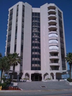 Oceans in Daytona Beach Shores offers a premier oceanfront living experience with its stunning 12-story atrium-style condominium featuring 77 one and two-bedroom units. Guests can enjoy impressive amenities such as a heated indoor pool, outdoor oceanfront pool, jacuzzi, sauna, and a fitness room, all in a beautifully landscaped setting with cascading plants and a waterfall.