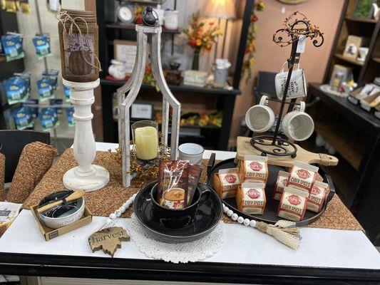 We specialize in gifts, home decor, candles, gourmet foods, wine, quilting fabric, notions and more.