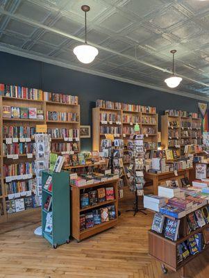 Raven Book Store, now located at 809 Massachusetts Street in Lawrence, KS, has transitioned to a more spacious and accessible environment, enhancing the shopping experience for its customers. With a focus on community engagement, the store features a larger children's section and displays local art, including paintings of their resident cats, Dashiell and Ngaio.