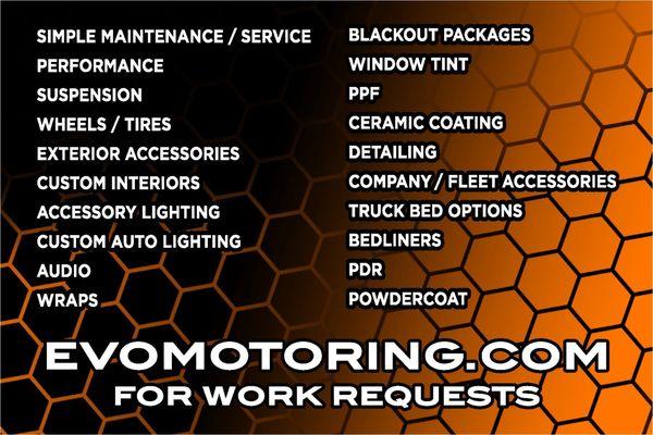 With 35+ years of combined experience and over 300 projects completed, Evo Motoring in Caddo Mills, TX is your trusted shop for automotive upgrades and maintenance. From lift kits, wheels, and tires to wraps, lighting, and audio, we bring big-shop capability with small-town service and personal attention. Backed by 100+ industry-leading vendors, we handle everything from off-road builds and daily drivers to high-end luxury vehicles needing precision care. Proudly serving Rockwall, Greenville, and the greater DFW Metroplex area with honest advice, dependable service, and quality craftsmanship you can count on for years to come.